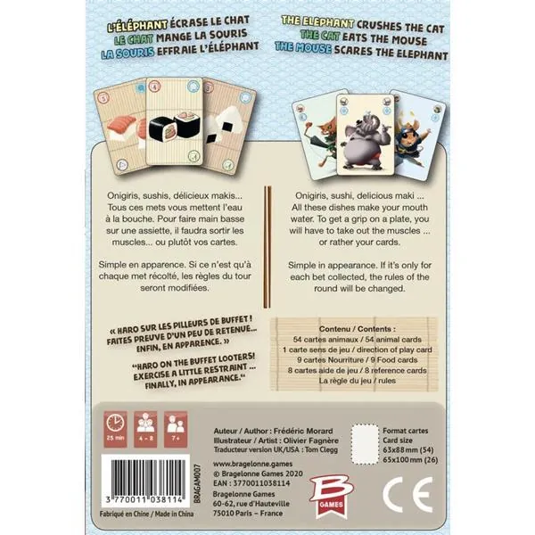 Onigiris, sushis, délicieux makis... Tous ces mets vous mettent l’eau à la bouche. Pour faire main basse sur une assiette, il faudra sortir les muscles... ou plutôt vos cartes. La souris contrecarrera l’éléphant qui contrera le chat... qui ne fera qu’une bouchée de la première. Simple en apparence. Si ce n’est qu’à chaque met récolté, les règles du tour seront modifiées.