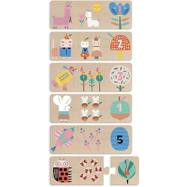6 puzzles de 3 pièces en bois illustrés par Suzy Ultman dans un univers kawai-chic doux et pétillant.