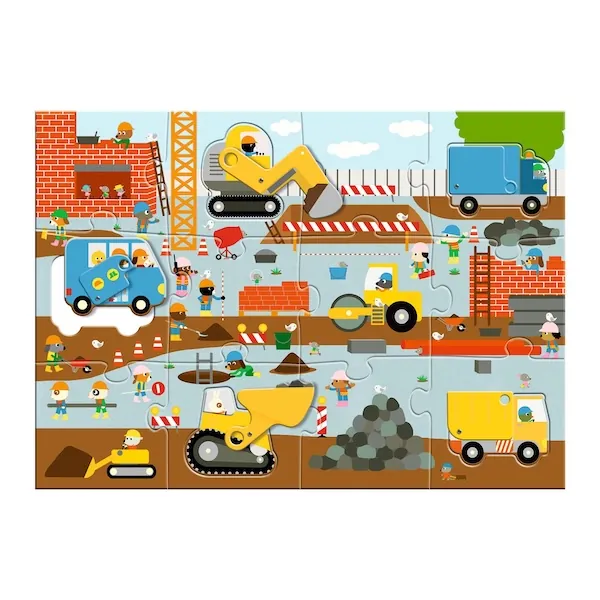 Contient : 12 pièces de puzzle + 5 pièces en forme de véhicules qui s'articulent.