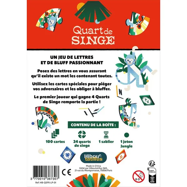 Le Quart de Singe est un jeu de lettres demandant de la réflexion mais également du bluff et de la malice pour piéger ses adversaires grâce aux cartes spéciales (changement de sens, x2, singe chapardeur...).