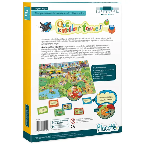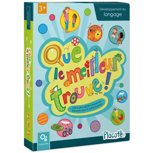 Que le meilleur trouve! est un jeu conçu pour solliciter les habiletés de compréhension de consignes et de catégorisation des enfants de 3 ans à 7 ans. Les enfants écoutent des consignes faisant intervenir différentes catégories (moyens de transport, instruments de musique, personnes, objets, etc.) et tentent d'être le joueur le plus rapide à repérer des éléments dans une scène illustrée. Le jeu comprend trois niveaux de difficulté proposant des consignes de plus en plus longues et complexes.