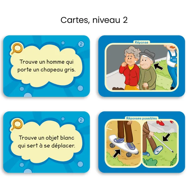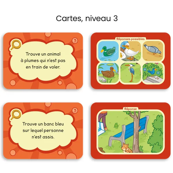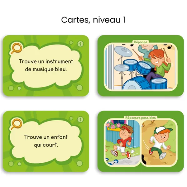 Trouve un animal blanc! Trouve un objet bleu qui sert à s'assoir! Trouve un aliment jaune qui n'est pas un fruit! Écoute bien les consignes et sois le plus rapide à trouver les éléments sur la planche de jeu.
