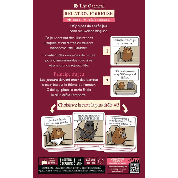 Le but ? Créer l’histoire avec la chute la plus drôle. Et chacun sait que les histoires d'amour finissent mal, en général ! Les joueurs vont devoir convaincre le juge de la manche que leur chute est la plus appropriée. Situations absurdes, dialogues douteux et rebondissements trash... Chaque carte, signée The Oatmeal, déborde d’un humour visuel sans filtre.