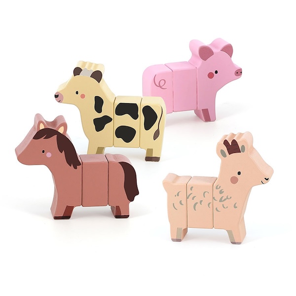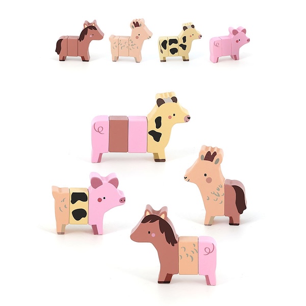 Avec des pièces aimantées en bois pour créer de multiples associations avec deux, trois ou quatre parties de vache, cheval ou chèvre.