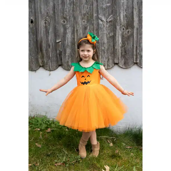 Une magnifique robe pour les petits, avec corsage orange vif et visage de lanterne citrouille noir souriant. La jupe est faite de couches de tulle orange doux, qui lui donne un beau volume.