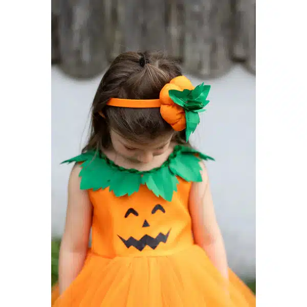 Un col vert à feuilles de citrouille et un bandeau orange avec citrouille en peluche.