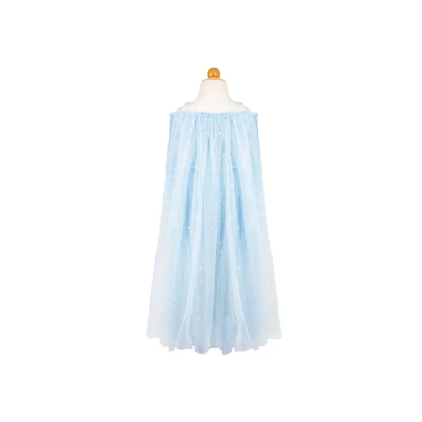 La robe est complétée par une cape en maille attachée à l’arrière, imprimée de cristaux chatoyants. La longue jupe en tulle permettra de faire des tours et de danser avec grâce.