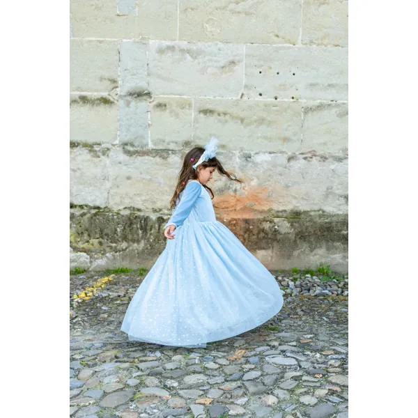 Avec un haut en velours bleu clair, doux et luxueux, bretelles et manches longues à l’épaule ajoutent une touche d’élégance. Le haut est joliment orné d’accents argentés avec un bijou bleu étincelant au centre de la poitrine, ajoutant une touche royale.