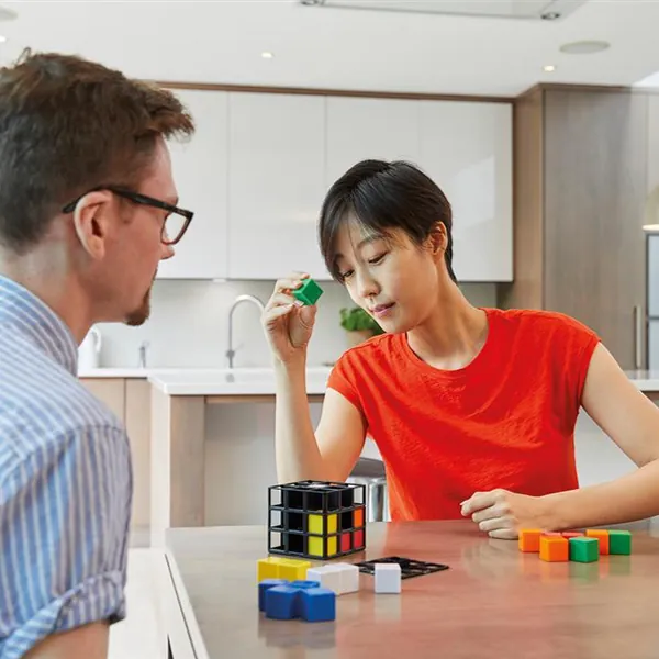 Dans Rubik’s cage, chaque joueur se voit attribuer une ou plusieurs couleurs de cubes (selon le nombre de joueurs). À son tour, un joueur peut choisir de glisser l’un de ses cubes dans un emplacement vide la structure, de tourner une tranche de 90°ou de retourner le cube ! Même une fois tous vos cubes placés, continuez de jouer en tournant les faces jusqu’à aligner 3 cubes d’une couleur que vous contrôlez !
