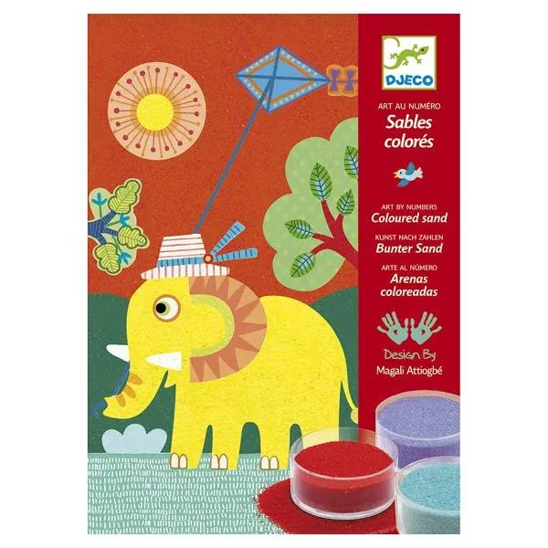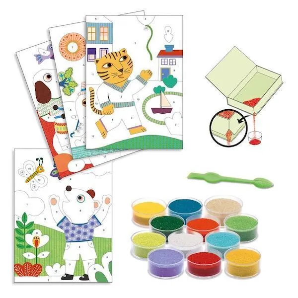 Contient : 4 cartes encollées (format 15 x 21), 12 couleurs de sable, 1 outil et 1 livret explicatif pas à pas en couleurs.