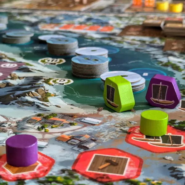Saltfjord se déroule dans un village de pêcheurs norvégien et est vaguement basé sur les mécanismes de tirage de dés de « Santa Maria », mais le jeu a été entièrement repensé et enrichi de nouveaux éléments.