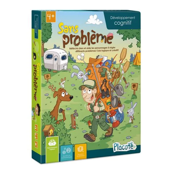 Sans problème est conçu pour aider les enfants de 4 à 9 ans à réfléchir à des problèmes qui peuvent se présenter dans la vie courante. Le jeu leur permet d’envisager différentes solutions pour un même problème. Il les amène ainsi à faire preuve de logique, mais aussi à penser «en dehors de la boite».