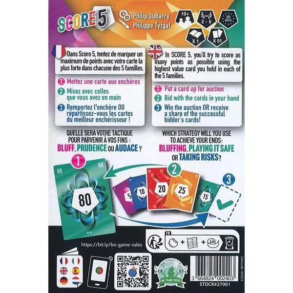 Score 5 est un jeu assez rapide qui se glisse dans une petite boîte, le jeu idéal pour démarrer votre soirée ludique et mettre les joueurs dans l’ambiance. Si vous aimez les jeux d’enchères, mais que vous cherchez à allier stratégie et bluff, Score 5 est un jeu qu’il vous faut tester d’urgence !