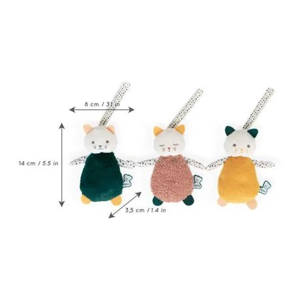 Avec leurs rubans pour les accrocher partout, ces petites peluches chats trouveront leur place sur l'arche d’éveil, dans sa poussette... pour l'accompagner partout !