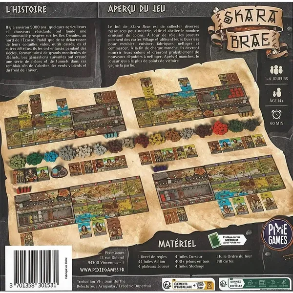 L'objectif de Skara Brae est de rassembler diverses ressources afin de nourrir, vêtir et abriter un nombre croissant de colons. Les joueurs piochent des cartes à tour de rôle et utilisent leurs ouvriers pour meubler, cuisiner, fabriquer, nettoyer et échanger. À la fin de chaque manche, les joueurs doivent subvenir aux besoins de leurs colons et créeront probablement plus de détritus à nettoyer. Après quatre manches, le joueur ayant accumulé le plus de points de victoire l'emporte.