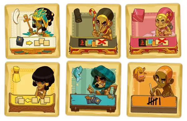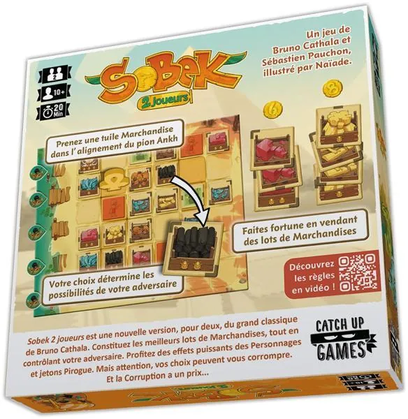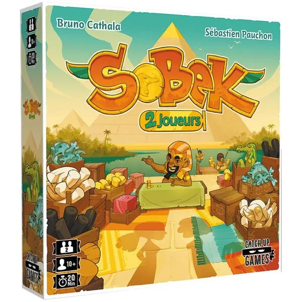 Dans Sobek 2 joueurs, deux adversaires collectent et vendent des Marchandises pour remporter le plus de Points de Victoire. Quand un joueur prend une Marchandise, il en sélectionne une dans l’alignement du pion Ankh et l’ajoute à sa main. Il place alors le pion Ankh dans l’alignement indiqué par la tuile qu’il vient de prendre, déterminant ainsi les choix de son adversaire.