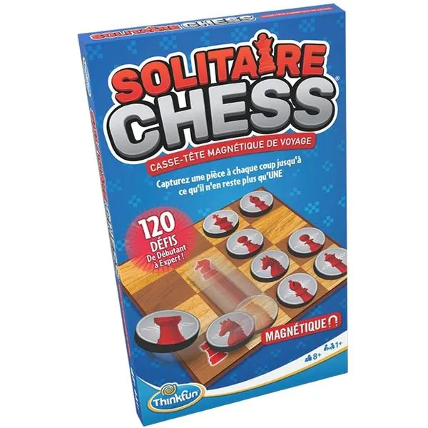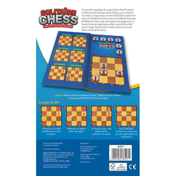 Les 120 défis solo vont du niveau débutant au niveau expert, augmentant en difficulté au fur et à mesure que vos compétences grandissent. Le livret magnétique et les pièces en font le jeu d'échecs idéal pour voyager. Résolvez tous les défis et vous deviendrez un maître des échecs en un rien de temps !
