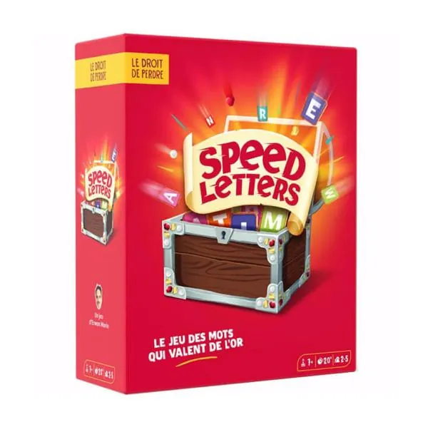 Speed Letters est une course de lettres où le but est de recréer un mot dévoilé au début du tour. Au top, chacun cherche dans son alphabet de 26 cartes un max de lettres faisant partie de ce mot pour les déposer dans le coffre et gagner le mot-trésor !