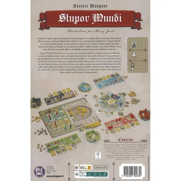 Ce titre expert pour 1 à 4 joueurs vous invite à développer votre territoire en tant que vassal de Frédéric II, à rassembler des alliés dans tout le bassin méditerranéen, à construire et renforcer votre château, ou bien promouvoir des spécialistes pour améliorer votre royaume.