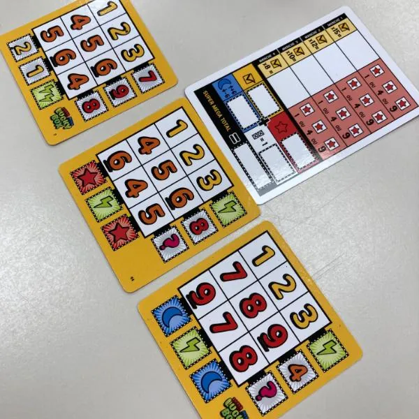 Chaque joueur dispose de 3 cartes comportant une grille de cases de 3 sur 3 remplies de chiffres allant de 1 à 9.