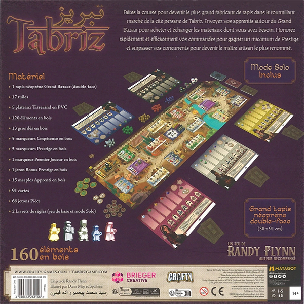 Les ressources sont limitées et le marché fluctue à chaque tour. Soyez attentif aux opportunités d'en obtenir plus pour moins cher, et veillez à éviter les moments où la ressource dont vous avez besoin est en rupture de stock partout. Gagnez en compétence pour attirer de meilleures commissions, faire avancer vos assistants à chaque tour, réclamer et remplir plusieurs commissions à la fois et gagner des bonus de prestige. En option, jouez avec le mode Atelier avancé pour que chaque tisserand ait sa propre capacité unique prise au début du jeu et à la fin de chaque tour.
