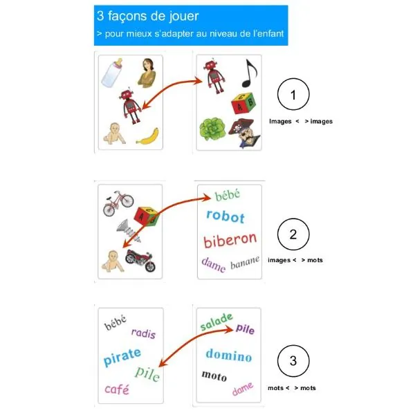 Il s'agit de retrouver la paire image-mot qui existe entre une carte-images et une carte-mots.