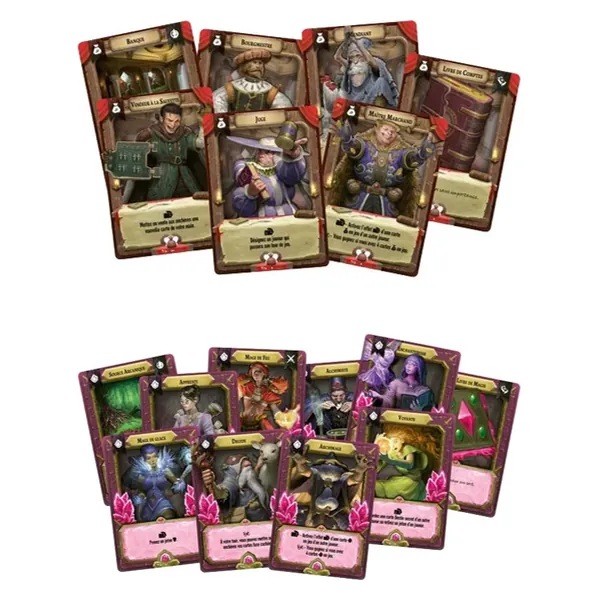 Chaque carte est liée à une famille (Nécromancie, Magie, Royaume ou Commerce) et possède parfois un type (Combattant, Terrain, Livre) influençant la partie. Le but : accomplir un objectif secret ou commun avant les autres… sans être éliminé !