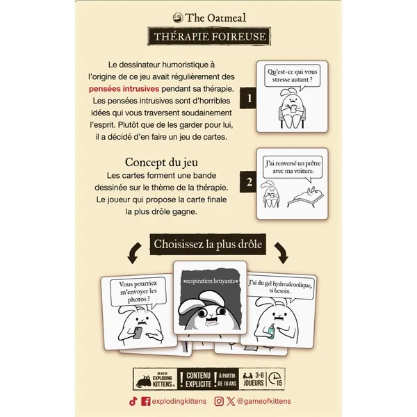 Conçu par The Oatmeal (le célèbre auteur de BD) et les créateurs d’Exploding Kittens, Thérapie Foireuse est un jeu à l’humour noir délibérément trash, réservé aux adultes. Avec plus de 400 cartes, chaque partie est unique. Âmes sensibles s'abstenir ! Les autres s'amuseront...comme des petits fous !