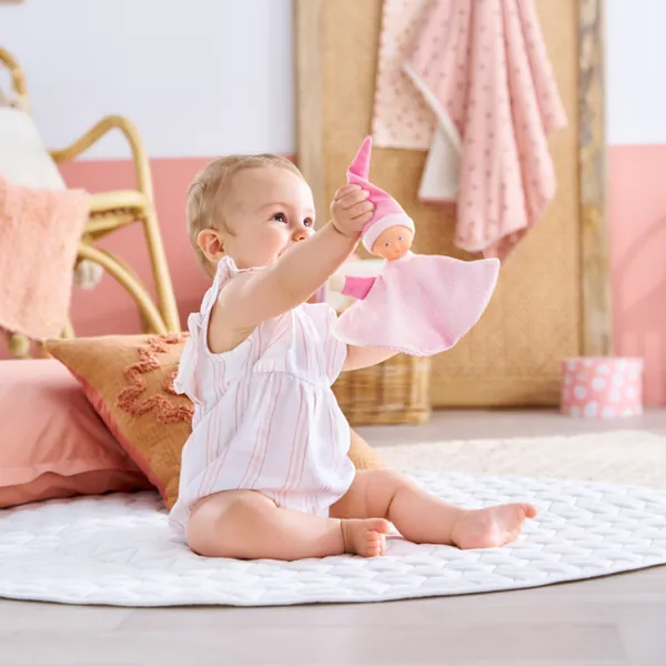 Le doudou Tidoudou Rêves d'Étoiles a la peau blanche et les yeux bleus peints.