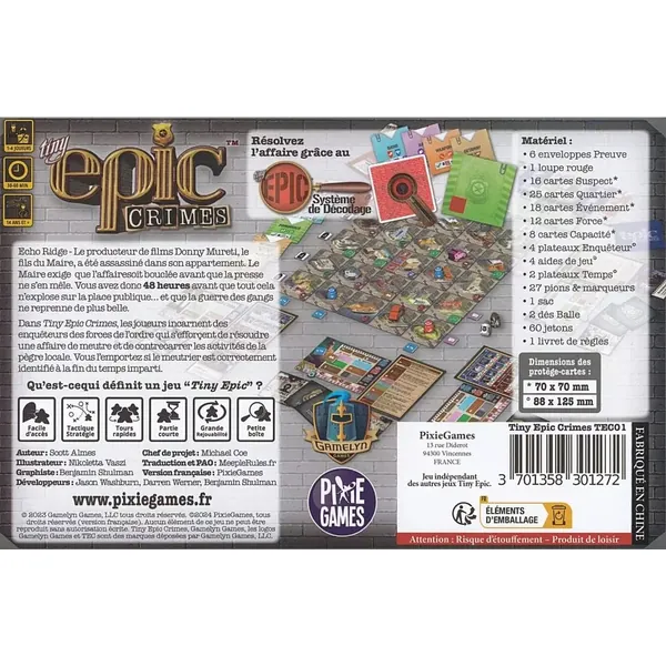 Tiny Epic Crimes est un jeu de déduction et de lutte contre le crime au rythme rapide, pour 1 à 4 joueurs, qui offre plusieurs façons de jouer.