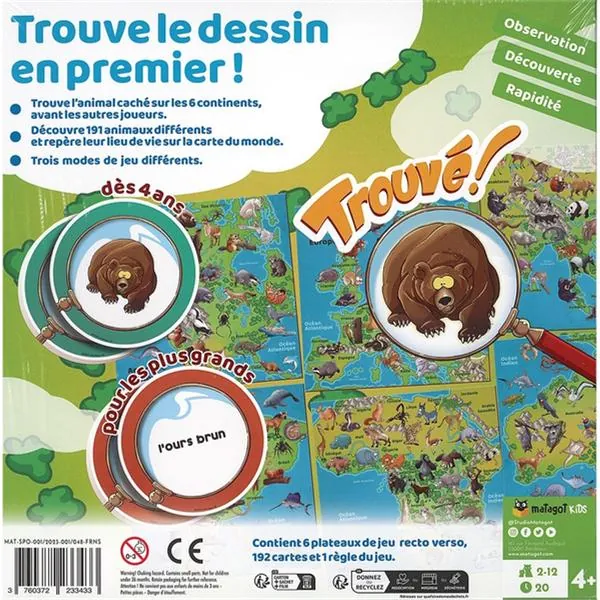 Avec près de 191 animaux à repérer sur la carte du monde, ce jeu de société te permettra de découvrir leur lieu de vie et d'en apprendre plus sur tes animaux préférés !
