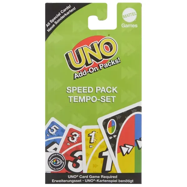 Uno : Speed Pack est une extension pour l'incontournable jeu de défausse Uno qui ajoute des cartes supplémentaires pour accélérer et intensifier vos parties de UNO !
