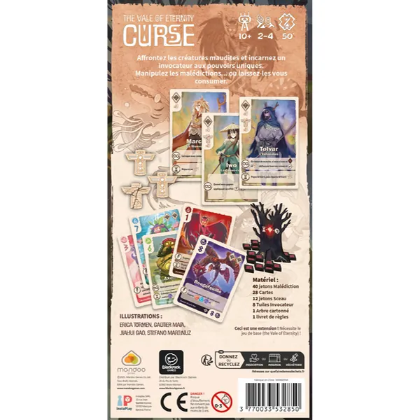 Cette extension introduit aussi deux nouvelles dynamiques : les malédictions, qui pèsent sur vos cartes et votre score final mais peuvent être apaisées pour gagner des points, et les sceaux, une ressource précieuse à briser pour invoquer ou à réparer pour se protéger.