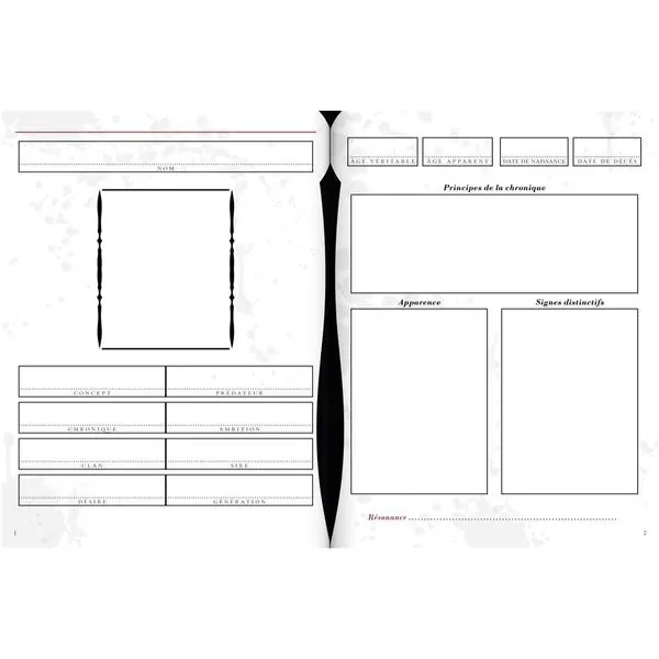 Ce journal de 80 pages contient une fiche de personnage étendue, des invitations à développer votre historique, de quoi prendre note des membres de votre coterie et de votre domaine, et garder une trace de qui est qui dans votre chronique.