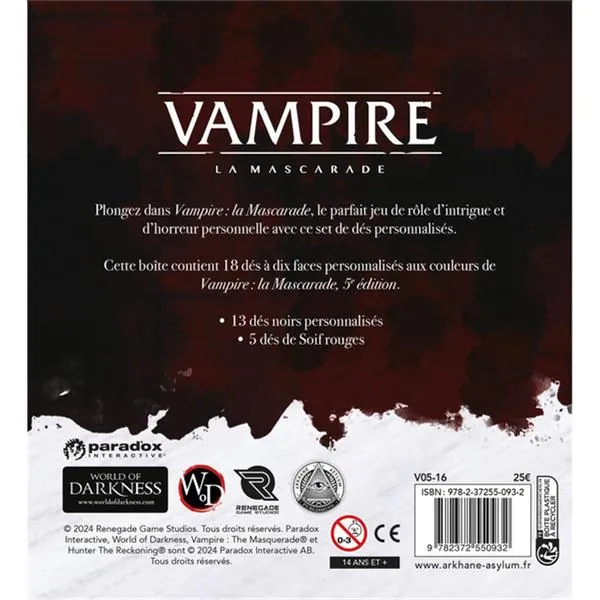 Cette boite contient 18 dés à dix faces personnalisés aux couleur de Vampire : la Mascarade 5è édition.