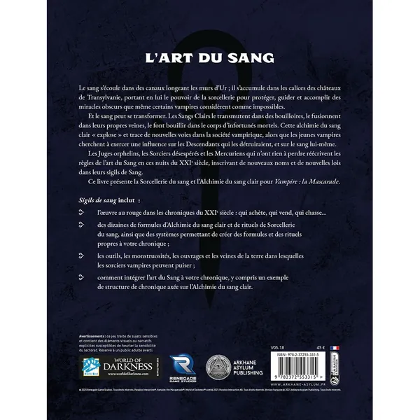 Cet ouvrage présente la Sorcellerie du sang et l’Alchimie du sang clair pour Vampire : la Mascarade.