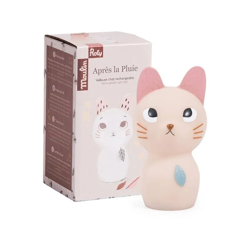 La veilleuse chat de la collection Après la pluie est une veilleuse en forme de chat qui diffuse une douce lumière. Nomade, avec 15 heures d'autonomie, elle se recharge par câble USB (inclus) en seulement 3 heures et comprend un mode timer pour s'éteindre automatiquement après 30 minutes. Grâce à son chargement par USB, pas de piles à remplacer