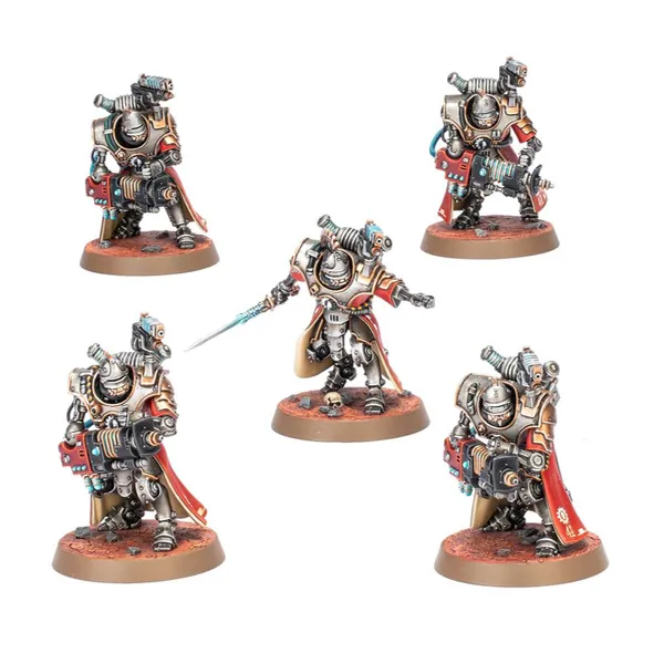 Les Hastarii sont des Skitarii en armure lourde qui déchaînent une puissance de feu cinglante et terriblement efficace. Les cônes d'énergie grandissants des projecteurs d'éradication des Exterminateurs perturbent la structure moléculaire de la cible, qui finit cruellement mutilée ou complètement vaporisée, tandis que les Fusiliers se chargent des éléments les plus lourdement protégés de l'ennemi à l'aide de leurs arquebuses à neutrons.