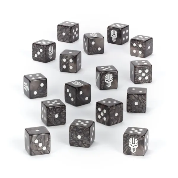 Ce produit est un set de 16 dés aux arêtes carrées pour les parties de Warhammer 40,000, sur le thème des Iron Warriors. Ils sont moulés en plastique acrylique gris sombre nacré avec des marquages blanc cassé, et ils mesurent 16mm de côté. Les faces 1 à 5 sont numérotées de façon traditionnelle, tandis que la face du 6 est frappée de l'icône brutale des Iron Warriors. Ces dés thématiques sont uniquement disponibles jusqu'à épuisement des stocks.