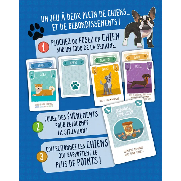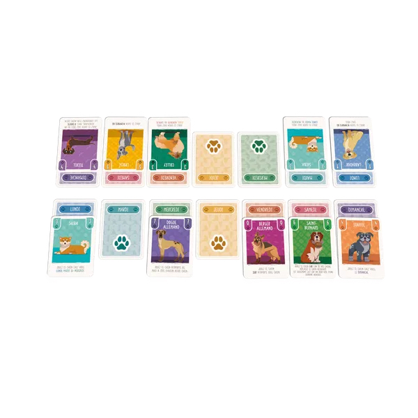 Enfin, vous pourrez tirer profit des cartes Événement pour déplacer, défausser ou échanger des chiens, et retourner ainsi la situation à votre avantage ! Dès qu'un joueur a rempli toute sa semaine, la partie prend fin : le joueur avec le plus de points sur les chiens devant lui l'emporte.