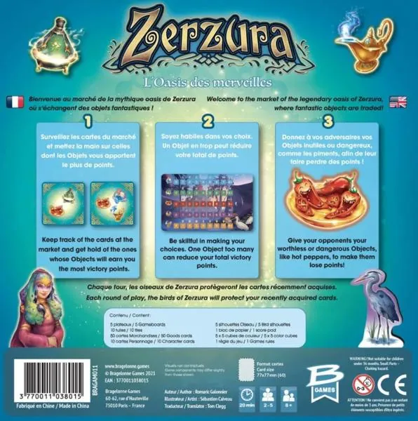Chaque année, les oiseaux de la Méditerranée migrent vers Zerzura. Cette mystérieuse oasis accueille aussi à l’occasion un marché où s’échangent des objets fantastiques. Les marchands s’y retrouvent dans l’espoir d’en ramener des merveilles pour leurs clients et mécènes. Si bien des objets assurent la gloire et la fortune, quelques-uns réservent des surprises. Serez-vous le plus habile des marchands de Zerzura ?